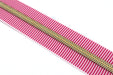 This Pink Zebra Stripe size #5 zipper tape features a gold nylon coil and comes in your choice of 1, 3, or 5 yards.